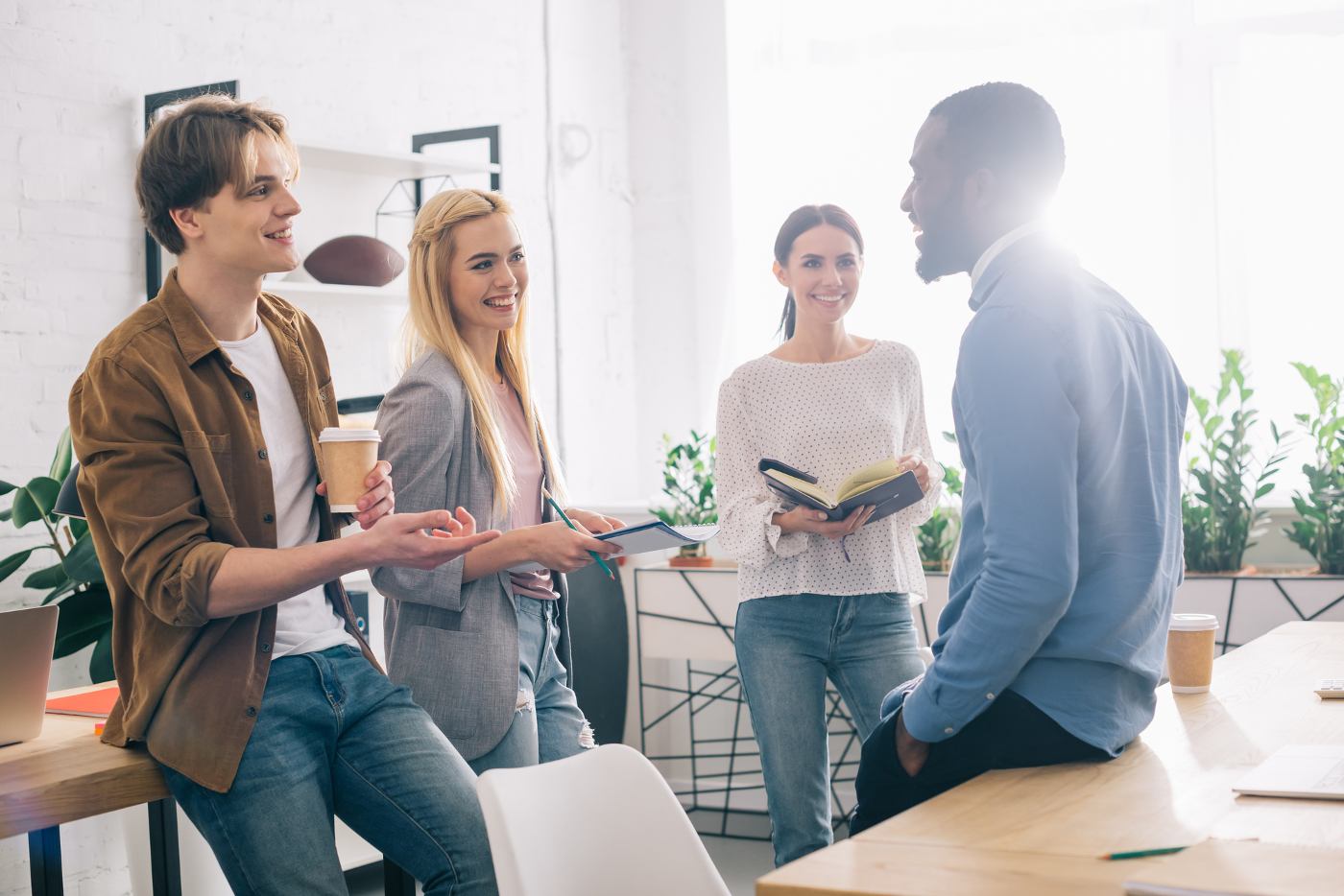 Four multicultural coworkers stand and have a conversation - Authentic Dialogue: Fostering Change for the Global Majority
