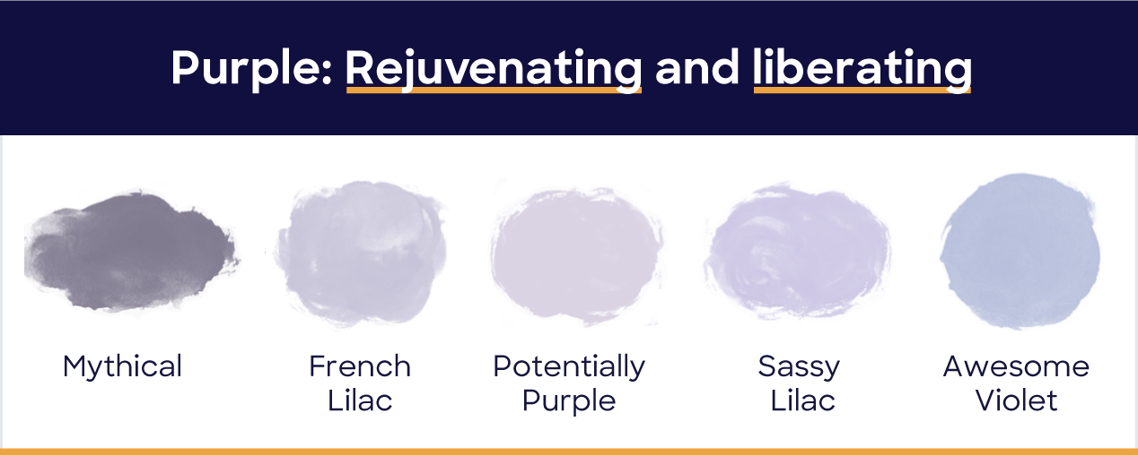 Purple contributes to a sense of authenticity and regal confidence. It’s also a liberating shade, promoting meditation and encouraging heightened spirituality.