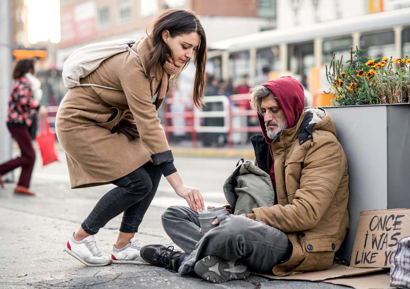 Young woman giving middle-aged homeless man money - Create Karma: What Karma Is and How to Affect Your Own