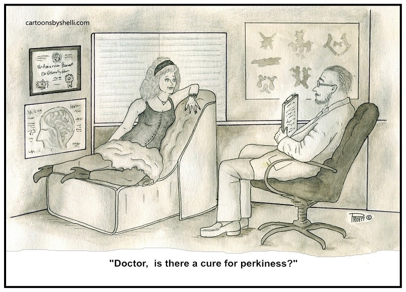 While sitting in a comfortable chair across from her psychiatrist, a fashionably clothed and accessorized young woman asks, “Doctor, is there a cure for perkiness?”