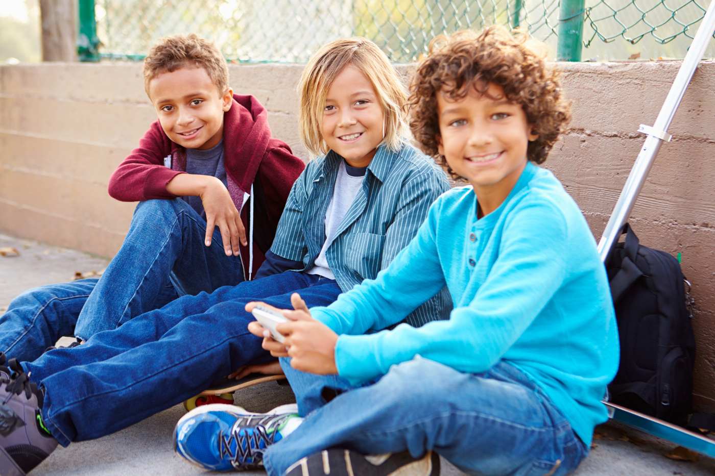 Three young boys sitting beside each other, one using a smartphone