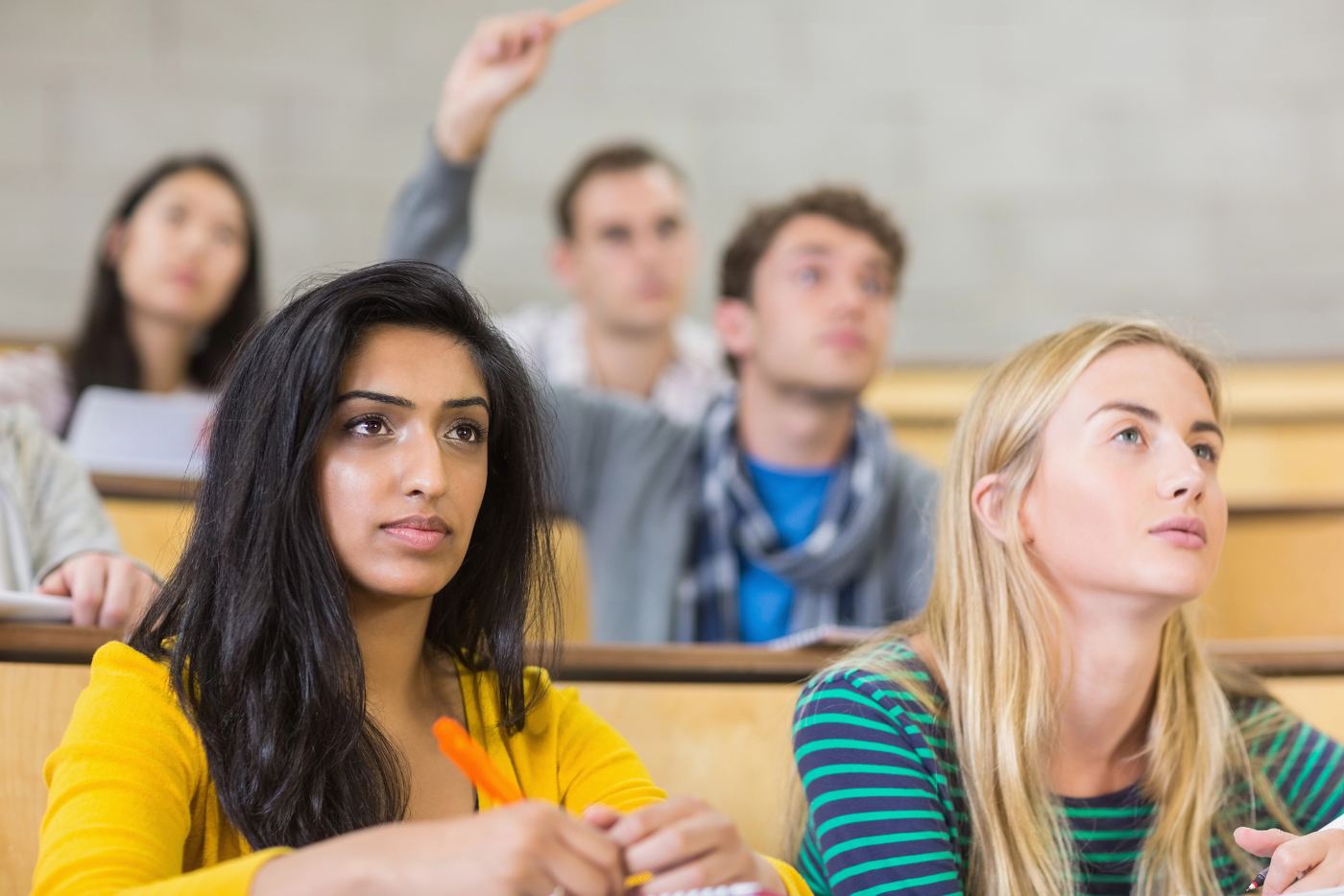 College students in lecture hall, one raising hand - Evolution and Creation: It’s Clear That the 2 Are Linked