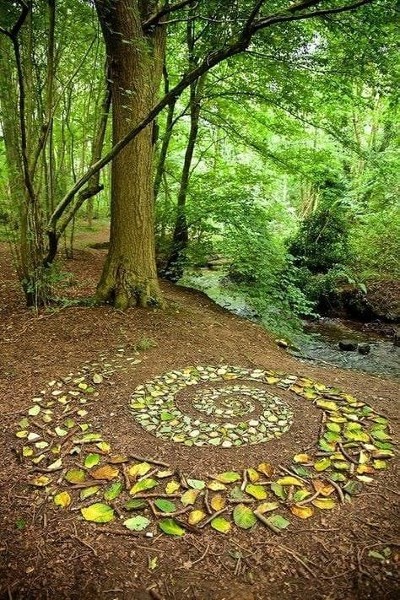 And fallen leaves inspire artists. Jon Foreman in Wales is an earth artist. His art is made directly in the landscape, as he sculpts the land itself into earthworks or makes designs using natural materials such as rocks, twigs or fallen leaves. The art itself is left in place; an ephemeral installation subject to whatever nature has in store.