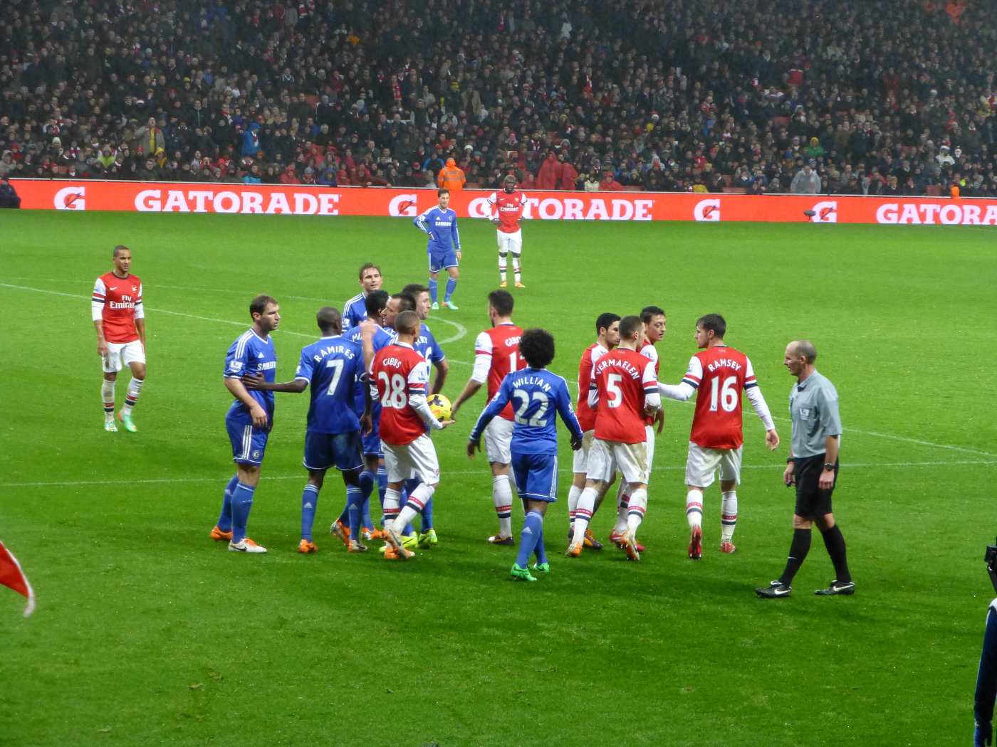 Chelsea vs. Arsenal British football game, with red and blue jerseys