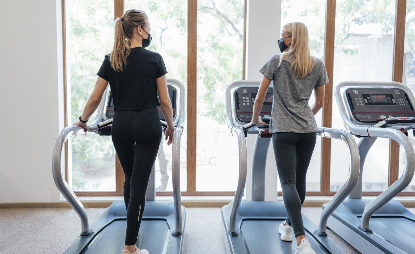 two women on treadmills in a gym