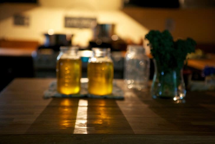 Two bottles of ghee on table (clarified butter)