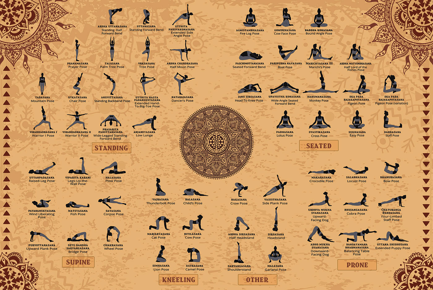 • POSE NAMES IN SANSKRIT AND ENGLISH – This poster gives the names of the Yoga poses both in English and Sanskrit to help you remember both names.