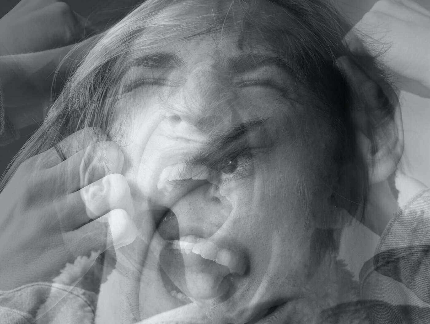 statue of a man with head in hand - photo mix of a woman talking to herself - desk with writing book, pens and clock - Get in Touch With Your (Inner) Life Therapist in 5 Steps