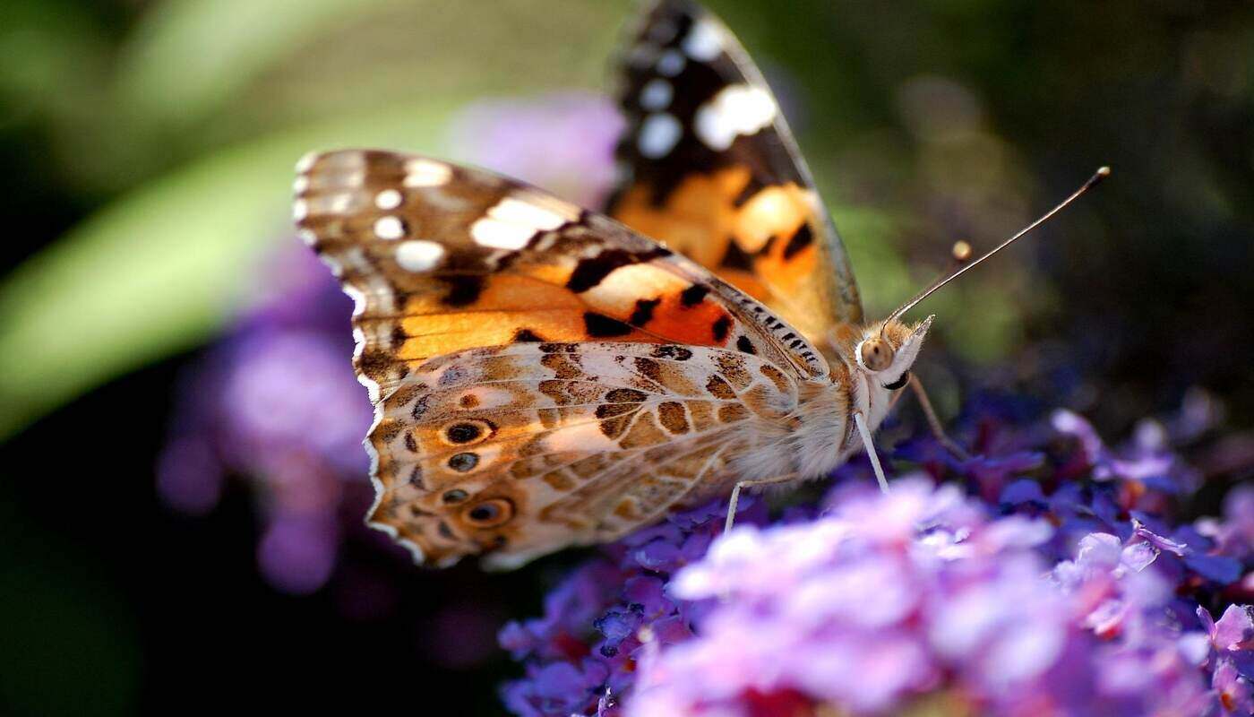 A couple of quail skittered across the gravel path. Solitary bees were diligently at work collecting pollen and nectar, feasting on the lupine flowers. A flaming dragonfly landed on a bare stick, while orange-streaked butterflies revelled in the purple blooms of the wallflowers.