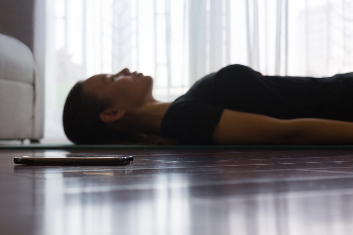 Woman lying on floor next to smartphone, meditating - 6 meditation practices for veterans to explore