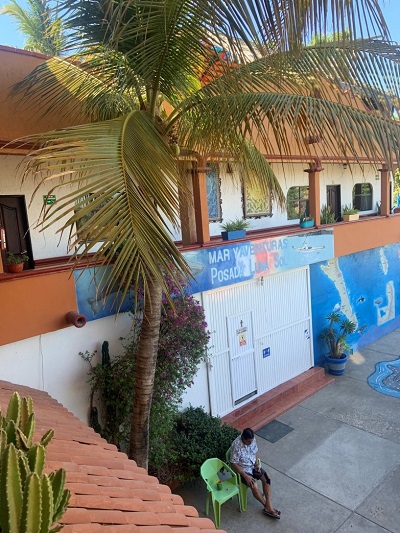 Ricardo, the Posada LunaSol proprietor, sitting at his morning perch in the courtyard. The sign