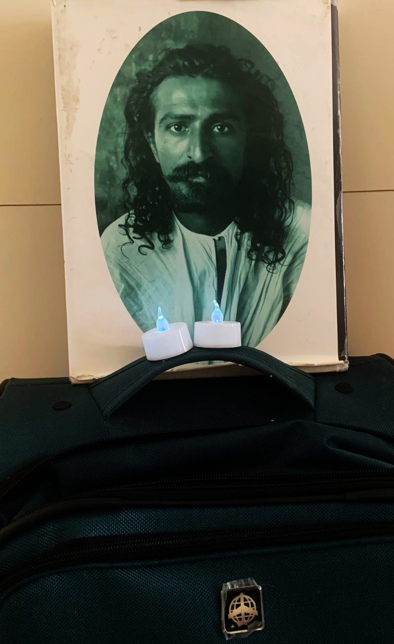 I decided to put in a little more time on the “retreat” part of my stay. I arranged one of the three pillows from the big bed on the floor and taped my favorite photo of Meher Baba, taken in England in 1931, onto the front of the wooden dresser cabinet inside of which I’d piled my clothes. I’d also brought four electric tea candles in one of my two little bathroom bags. I pulled my suitcase over, piled some books on it, set the candles down on top of the books and turned their little switches on to illuminate the picture.