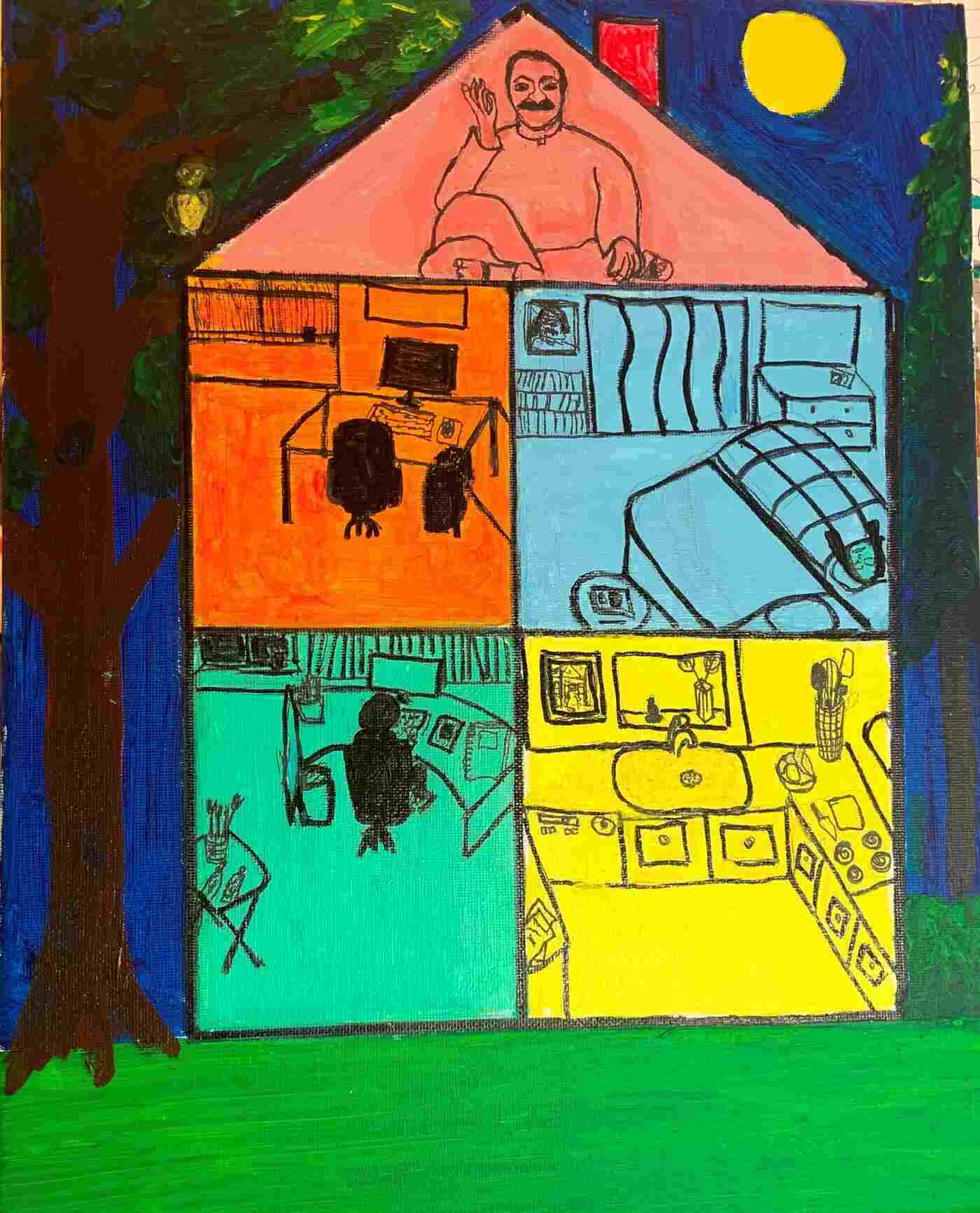The figure at the top of the house is Meher Baba, the personification of the “Higher Power” of the couple.