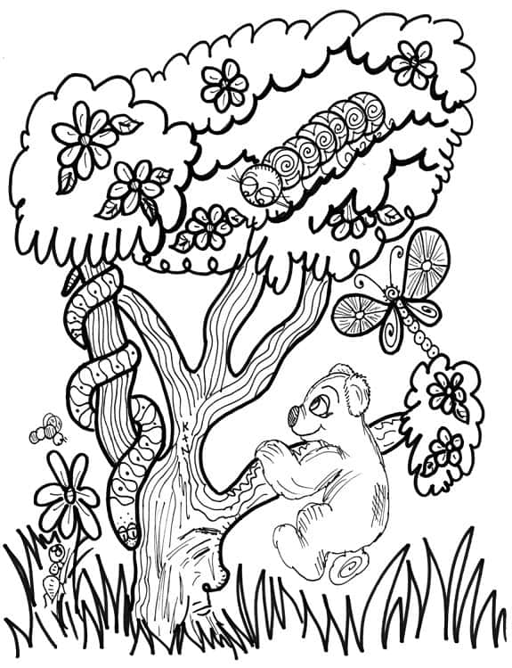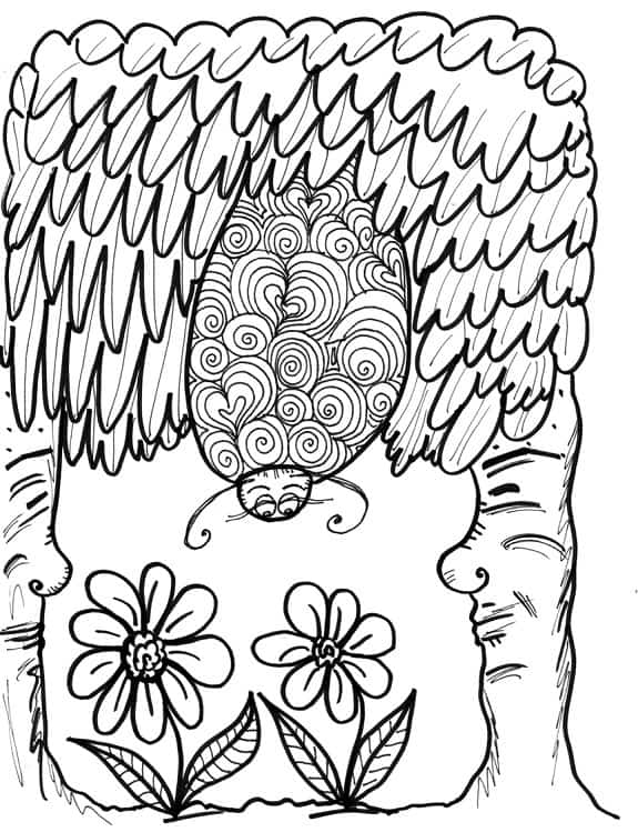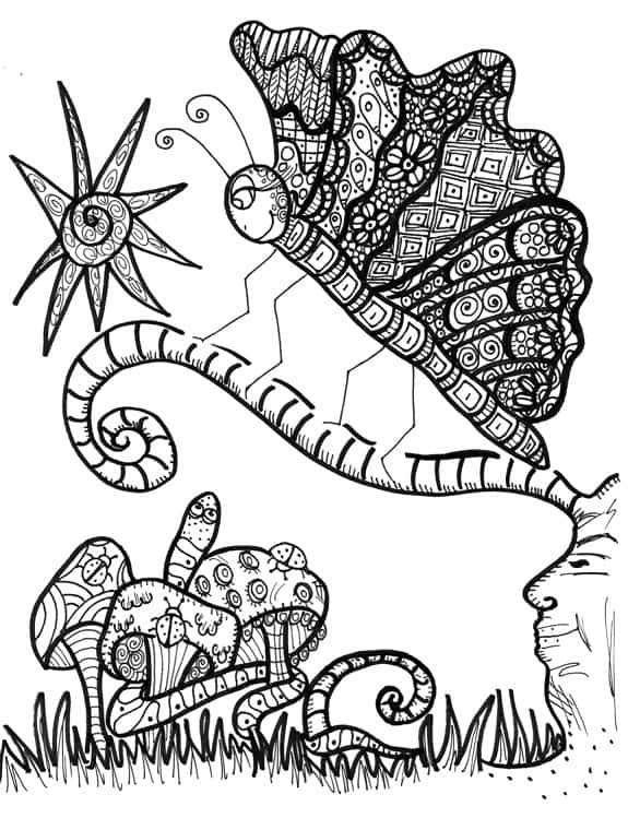 Directly below, you’ll find six complimentary pictures to print and color from We All Have Wings, the second book in The Mindful Word’s animal storybook/coloring book series and the follow-up to The Way of the Bear. By making use of the butterfly metaphor, along with eloquent yet easy-to-understand language and captivating pictures of cute critters and elegant landscapes, the book’s author Kathy Roberts and illustrator Dawn Collins are able to teach children about the inevitable process of change.