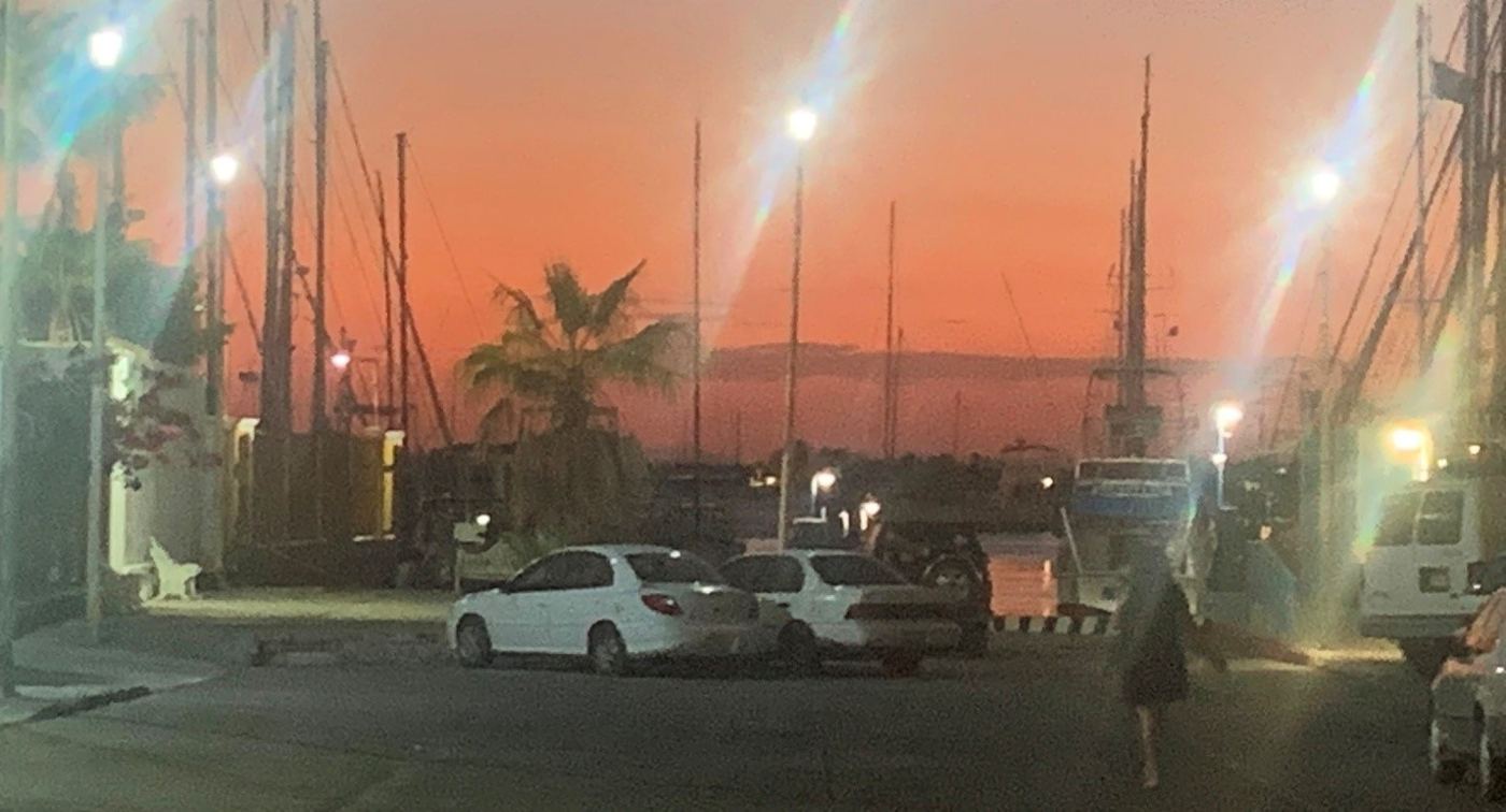 The street I turn onto is residential. There are several of the orange-ish “spice-coloured” haciendas that I’m so fond of, and several more beige or dark ones. Walking along, I pass an intersection that goes downhill and has a clear view of a lovely sunset over the bay. I decide to give Barbara a call, to share the view with her on Facetime.