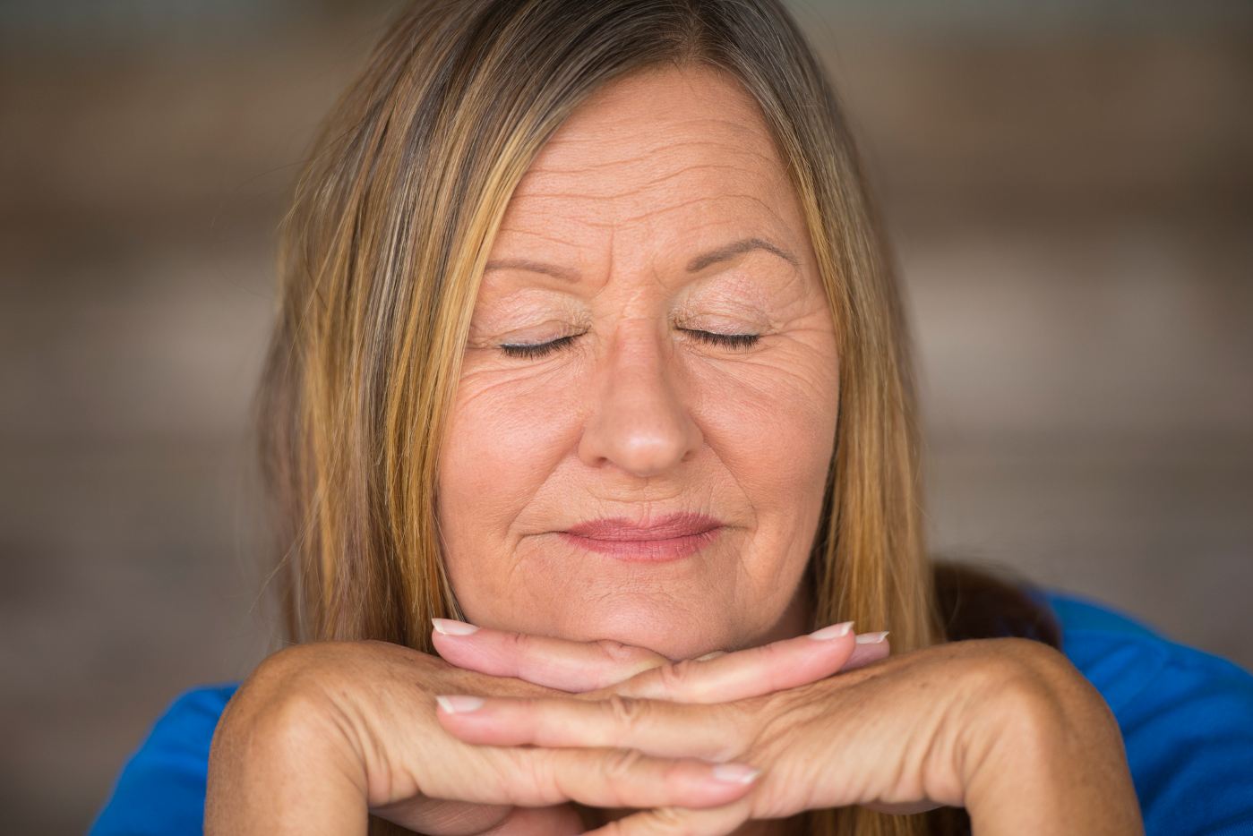 Woman with eyes closed, chin resting on hands - Practice Shamata by Observing a Candle for 3 Minutes a Day
