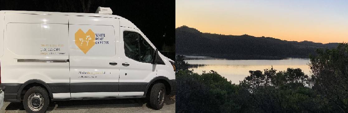 Left: One of the delivery vehicles of White Pony Express, which delivers up to 20,000 pounds a day of fresh food free of charge to shelters and food pantries in Contra Costa County, California. Right: A reservoir passed during the author’s weekly early-morning food-delivery run.