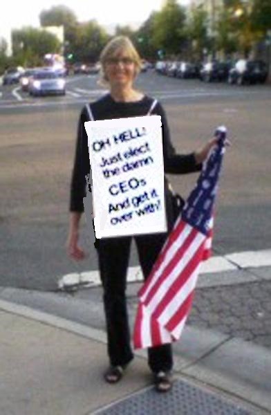 Mary Ellen Ratcliff at Occupy Walnut Creek protest with sign in 2012 - Agency Personified: An Interview With a Social Justice Activist