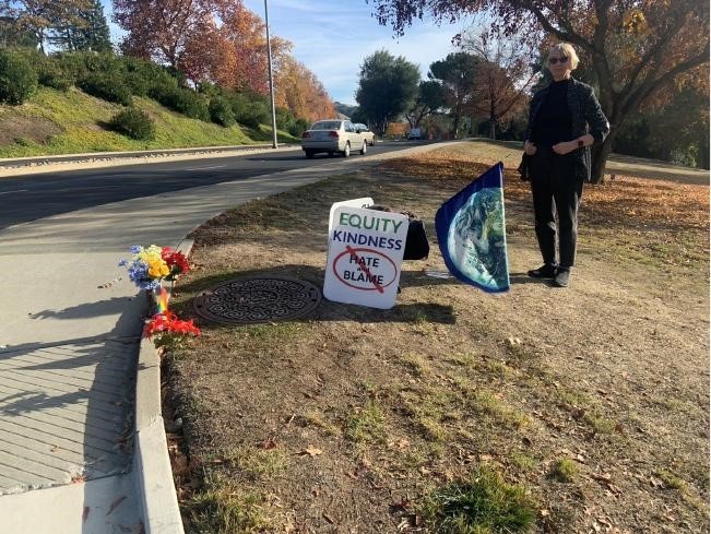 There is a certain three-way intersection that everyone who enters or leaves Rossmoor passes. On a corner of that intersection, a longtime resident named Mary Ellen Ratcliff has stood for two hours each day, five days a week, since shortly after the murder of George Floyd, 2.5 years ago. Along with her various signs there is always a flag of Earth seen from space, “because for me, we are all earthlings first.” She often wears blue and yellow to support Ukraine. Lately, she has worn all black to grieve for victims of shootings.