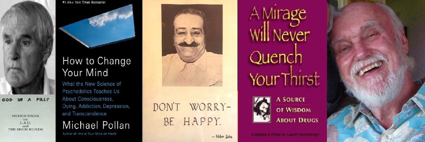 Composite photo of book covers and images that relate to psychedelics, including photos of Ram Dass and Meher Baba