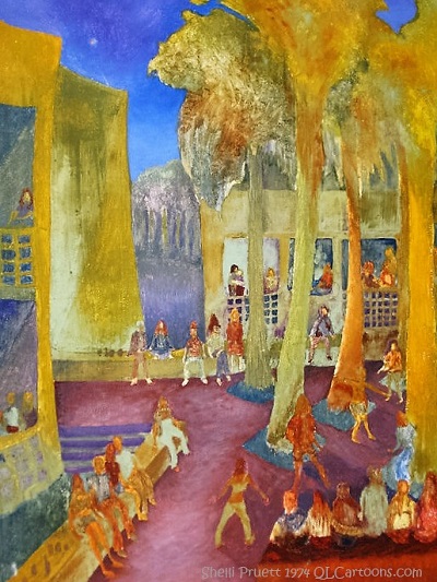 A painting of social life on the New College campus on a weekend evening in the late ‘60s, by Shelli Pruett (used with permission of the artist)
