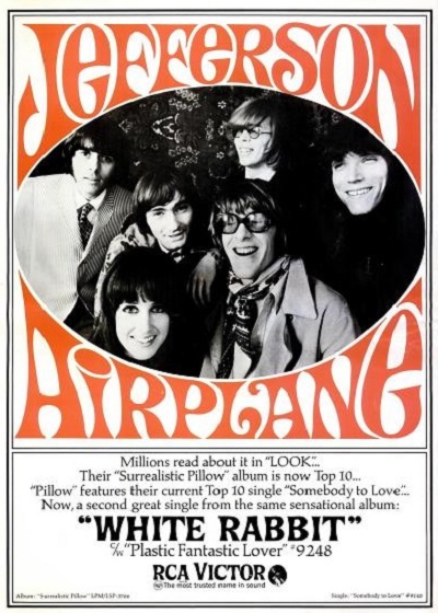 The “psychedelic” style of many rock posters of the ’60s, this one for the “Airplane” mentioning a song likening Alice’s journey in Wonderland to a trip.
