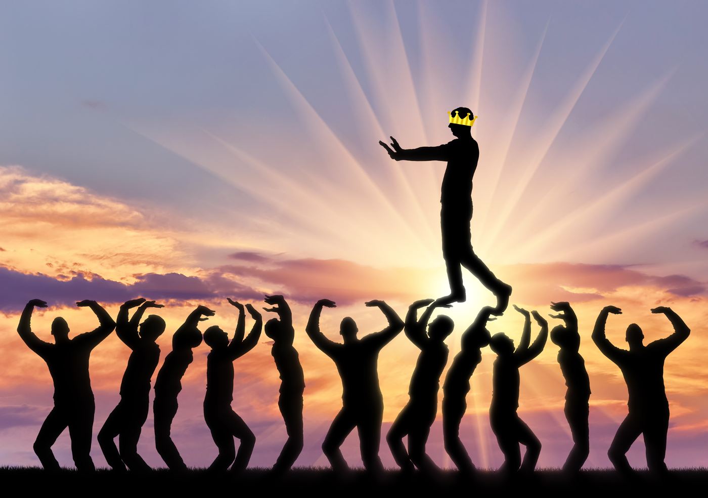 Silhouette of narcissist wearing crown over eyes walking on other silhouettes