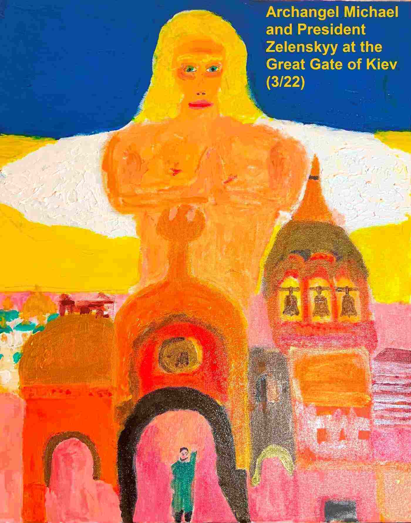A friend had written me about a project of painting “Ukraine Angels” and I was inspired to copy Hartmann’s design onto the foreground of my canvas that appears at the top of this article. Ironically, perhaps, Hartmann’s piece is Russian in style, but I remain inspired by it, and placed Archangel Michael (who I learned is the patron Saint of Kiev) and President Zelenskyy there, defending the city, in visionary space.